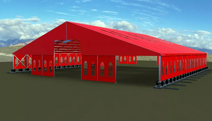 而篷房屬于可拆裝移動(dòng)建筑,采用高強(qiáng)度鋁合金和防火阻燃篷布建設(shè),整體重量輕,對(duì)地面要求非常低,一般只需要場(chǎng)地平整即可,施工無(wú)污染,按需求多次移動(dòng)搭拆,部分異形場(chǎng)地甚至可以做到跟隨山勢(shì)等條件搭建,尤其適合工礦企業(yè)的復(fù)雜作業(yè)場(chǎng)地。