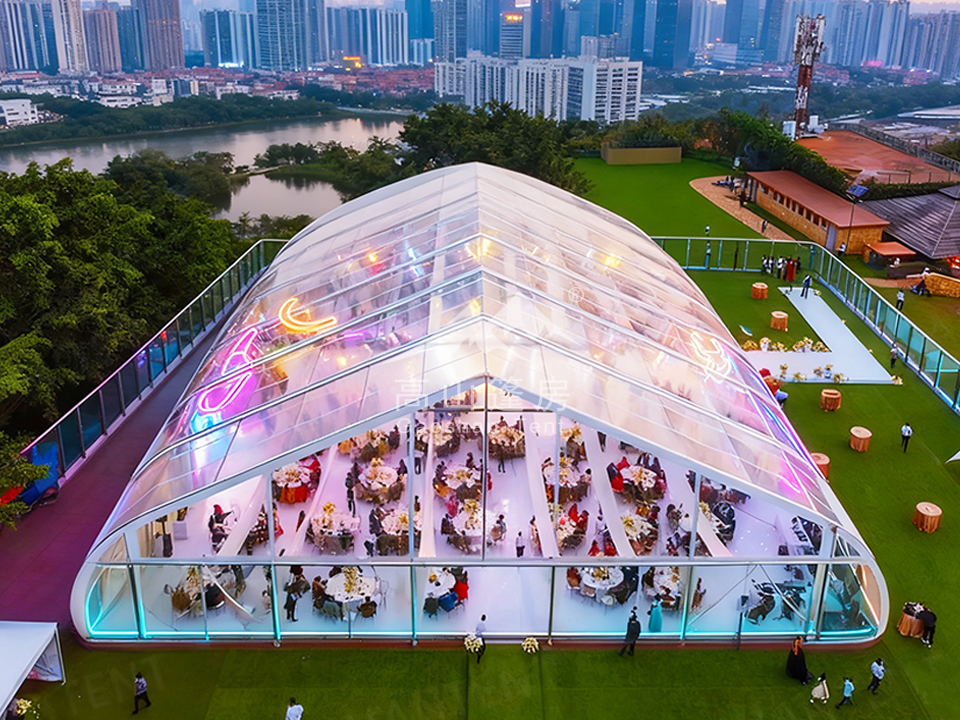 桃型篷房以其獨(dú)特的弧形外觀和卓越的功能性能,成為現(xiàn)代戶(hù)外活動(dòng)的理想選擇。它結(jié)合了美學(xué)設(shè)計(jì)與實(shí)用工程,在各類(lèi)場(chǎng)景中展現(xiàn)出強(qiáng)大的適應(yīng)性。以下為您詳細(xì)介紹其核心優(yōu)勢(shì)與應(yīng)用價(jià)值。